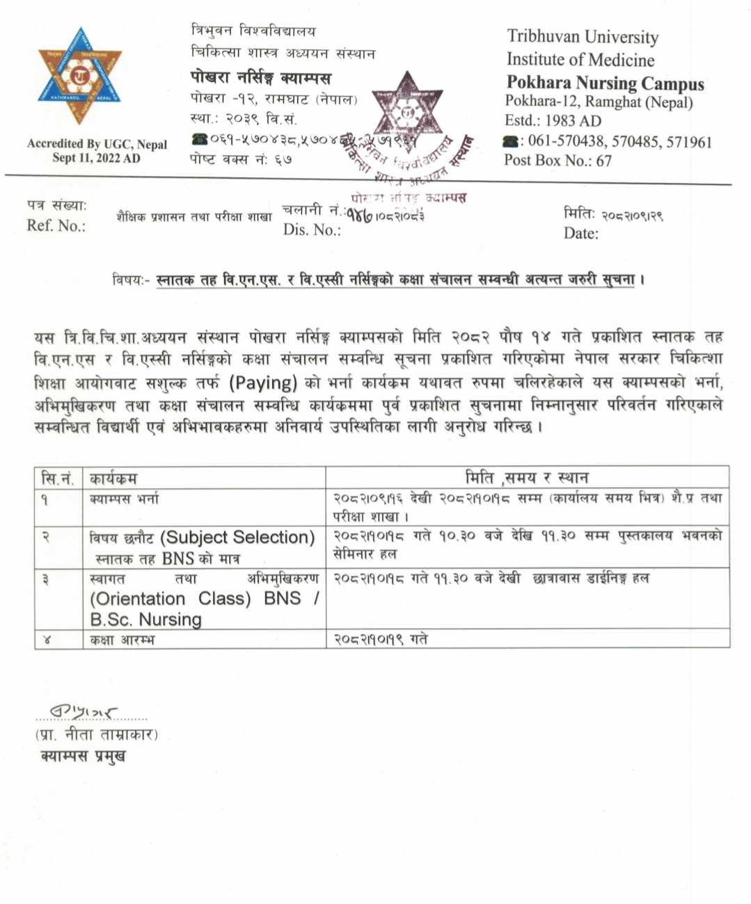 स्नातक तह वि.एन.एस. र वि.एस्सी नर्सिङ्ग प्रथम वर्षको कक्षा संचालन मिति परिवर्तन भएकाे सम्वन्धी अत्यन्त जरुरी सुचना ।