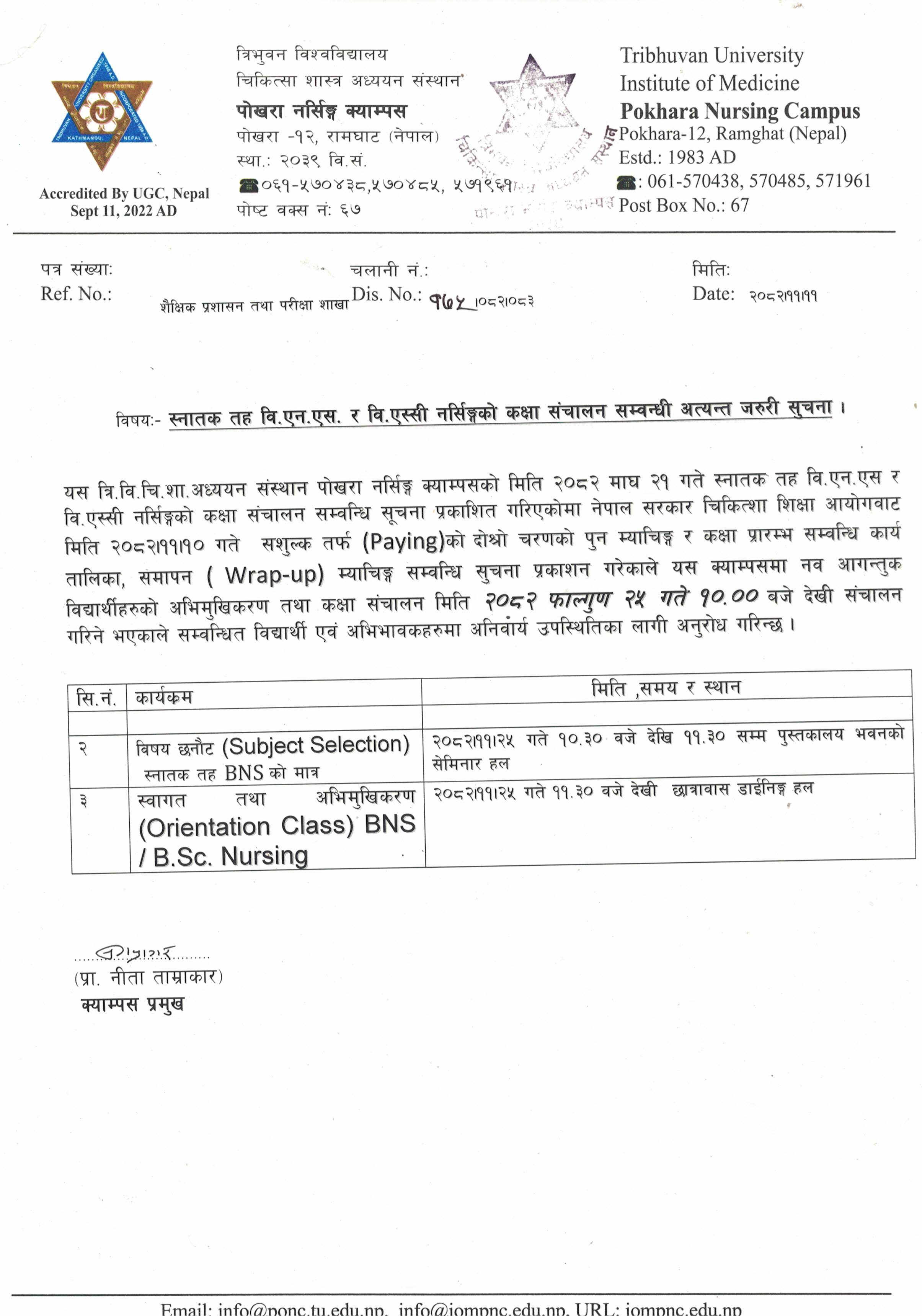 Final Notice for Orientation and Class start of BNS and Bsc Nursing 1st Year.