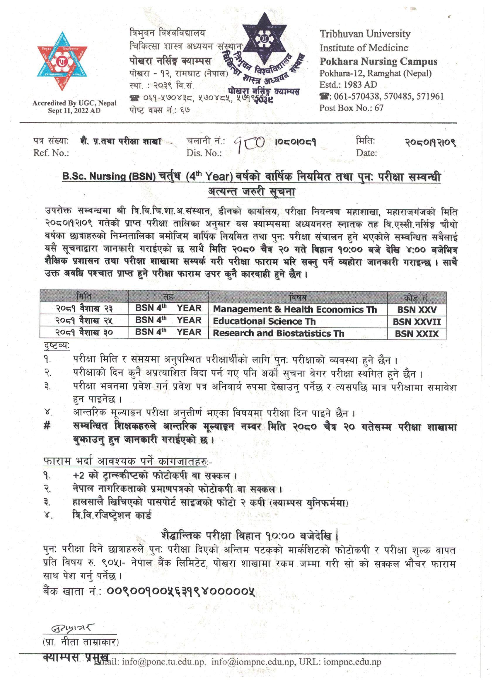 स्नातक तह वि.एस्सी. नर्सिङ्ग (BSN) तृतीय वर्षको वर्षिक नियमित तथा पुनः परीक्षाको संशोधित परीक्षा तालिका सम्बन्धी सूचना