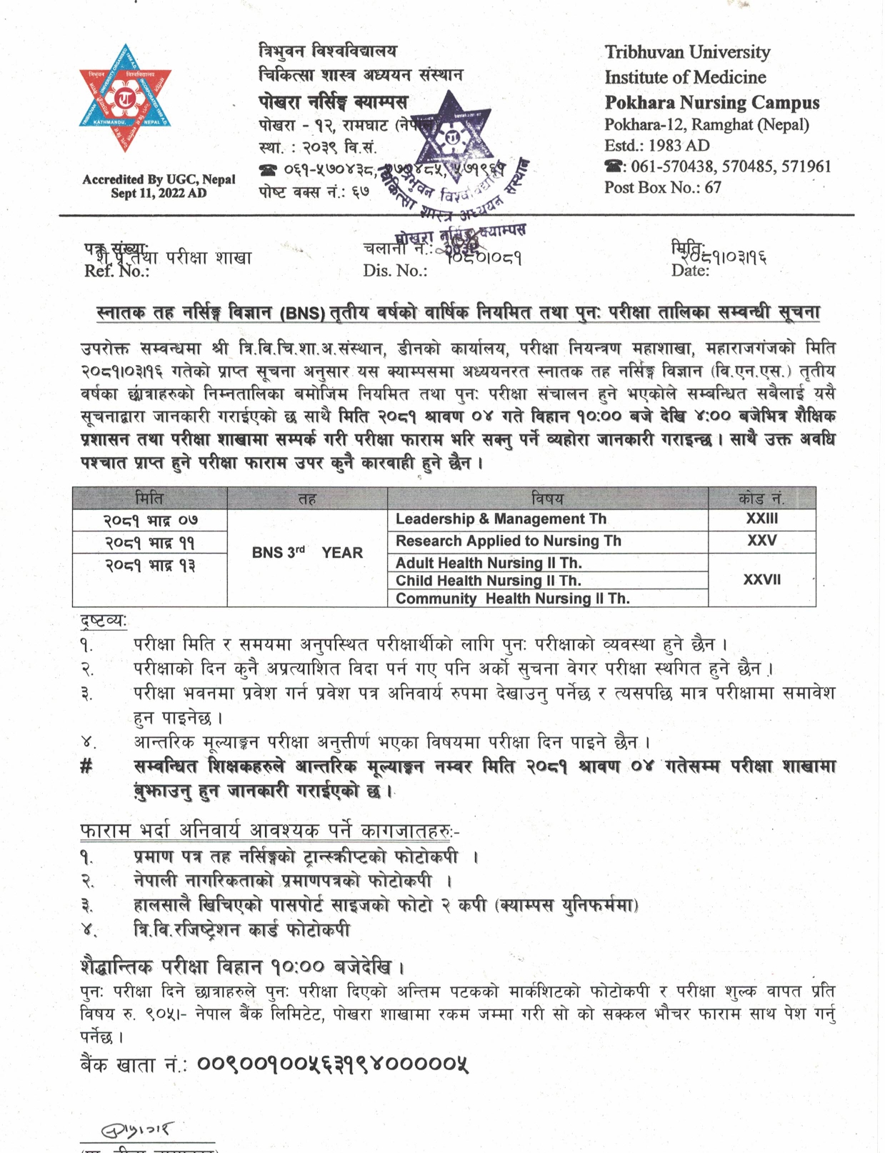 स्नातक तह नर्सिङ्ग विज्ञान (BNS) तृतीय वर्षको वार्षिक नियमित तथा पुनः परीक्षा तालिका सम्वन्धी सूचना