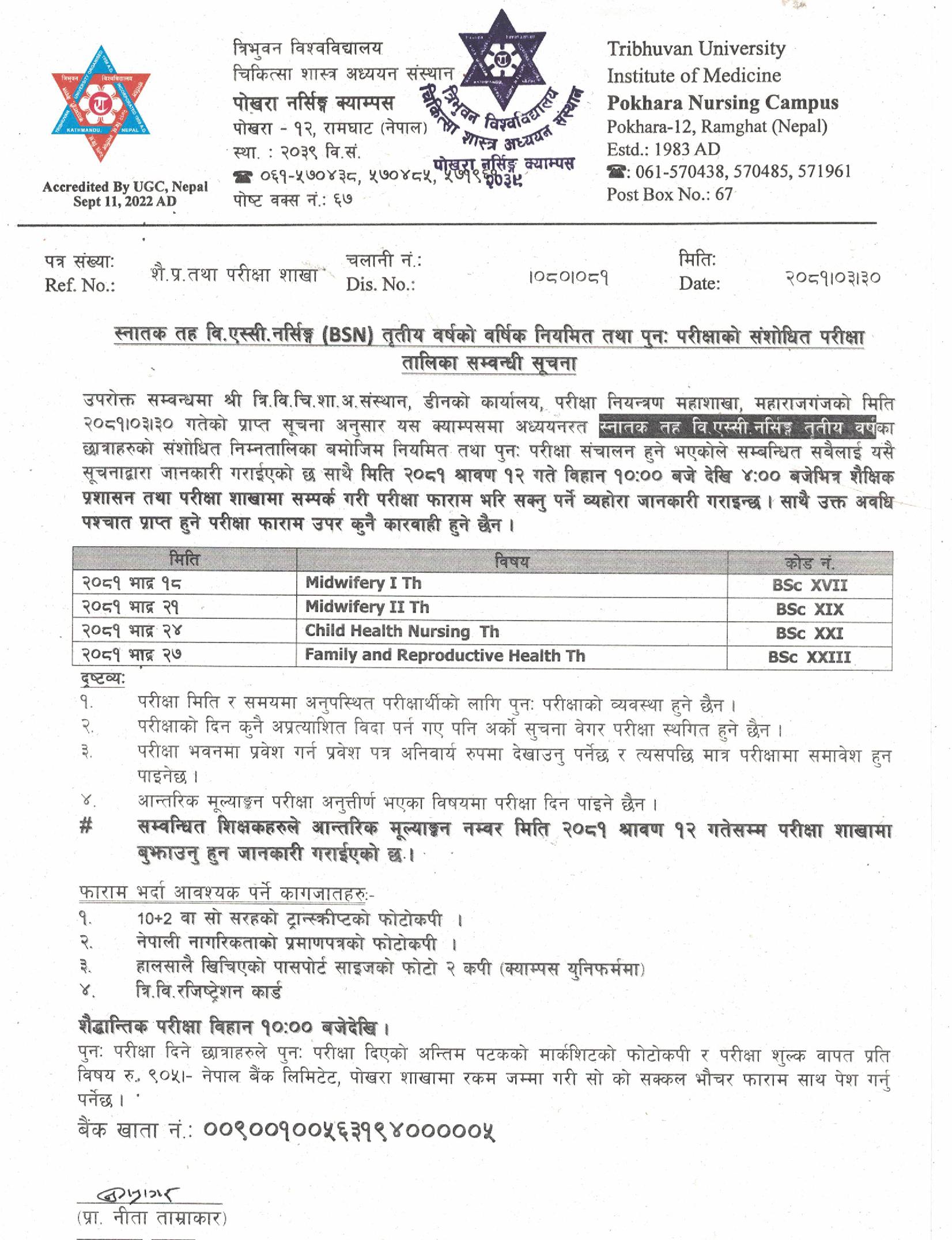 स्नातक तह वि.एस्सी. नर्सिङ्ग (BSN) तृतीय वर्षको वर्षिक नियमित तथा पुनः परीक्षाको संशोधित परीक्षा तालिका सम्बन्धी सूचना