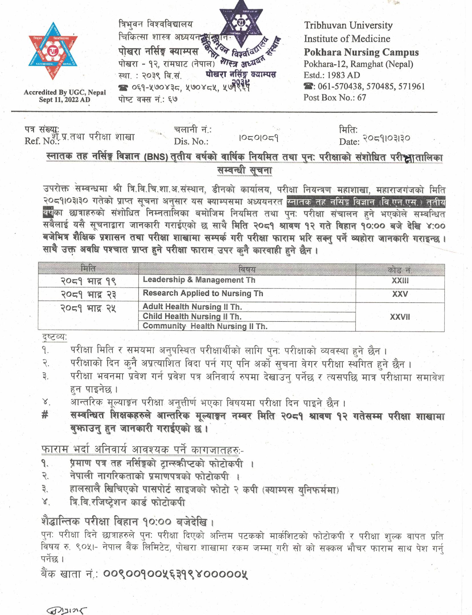 स्नातक तह वि.एस्सी. नर्सिङ्ग (BNS) तृतीय वर्षको वर्षिक नियमित तथा पुनः परीक्षाको संशोधित परीक्षा तालिका सम्बन्धी सूचना