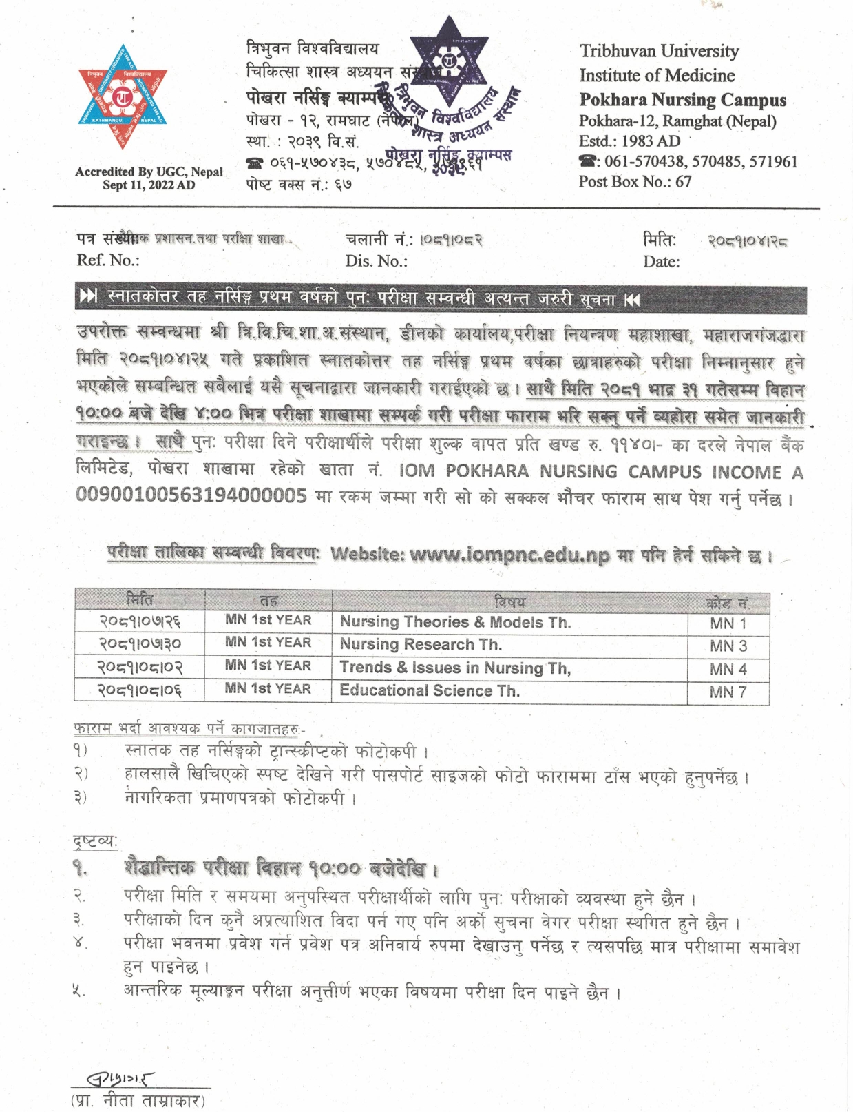 स्नातक तह वि.एन.एस. नर्सिङ्ग (BNS) तृतीय वर्षको वर्षिक नियमित तथा पुनः परीक्षाको संशोधित परीक्षा तालिका सम्बन्धी सूचना