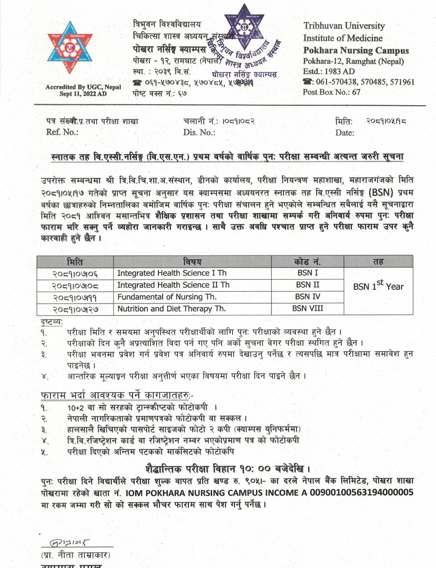 स्नातक तह वि.एस्सी. नर्सिङ्ग (BSN) तृतीय वर्षको वर्षिक नियमित तथा पुनः परीक्षाको संशोधित परीक्षा तालिका सम्बन्धी सूचना