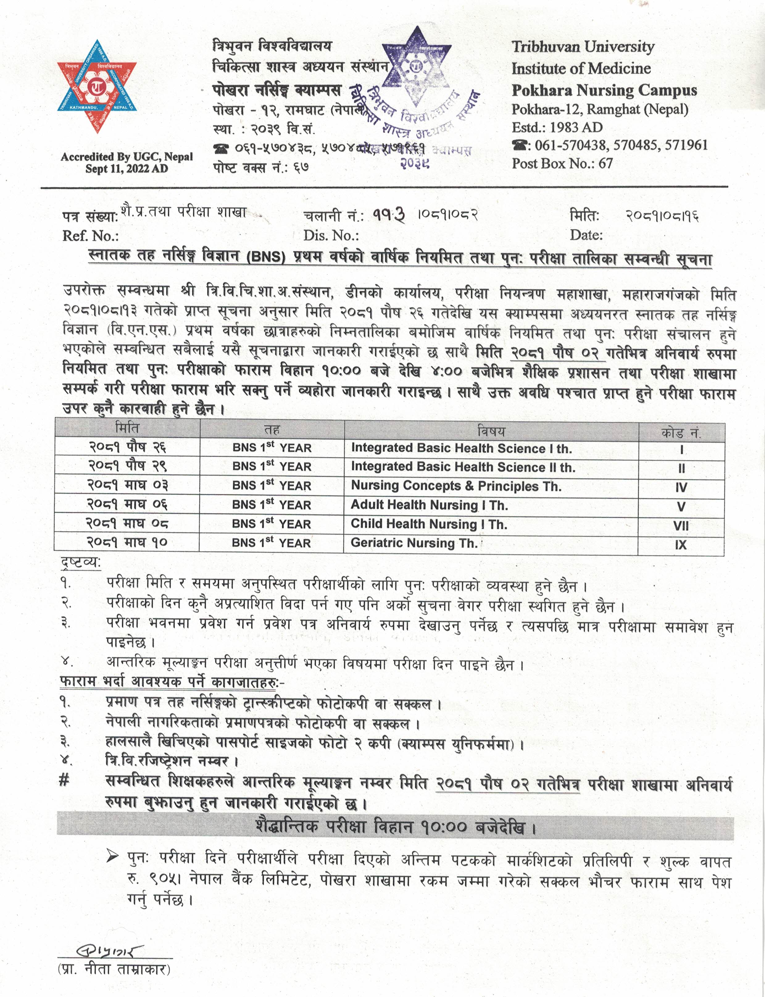 स्नातक तह नर्सिङ्ग विज्ञान (BNS) प्रथम वर्षको वार्षिक नियमित तथा पुनः परीक्षा तालिका सम्बन्धी सूचना