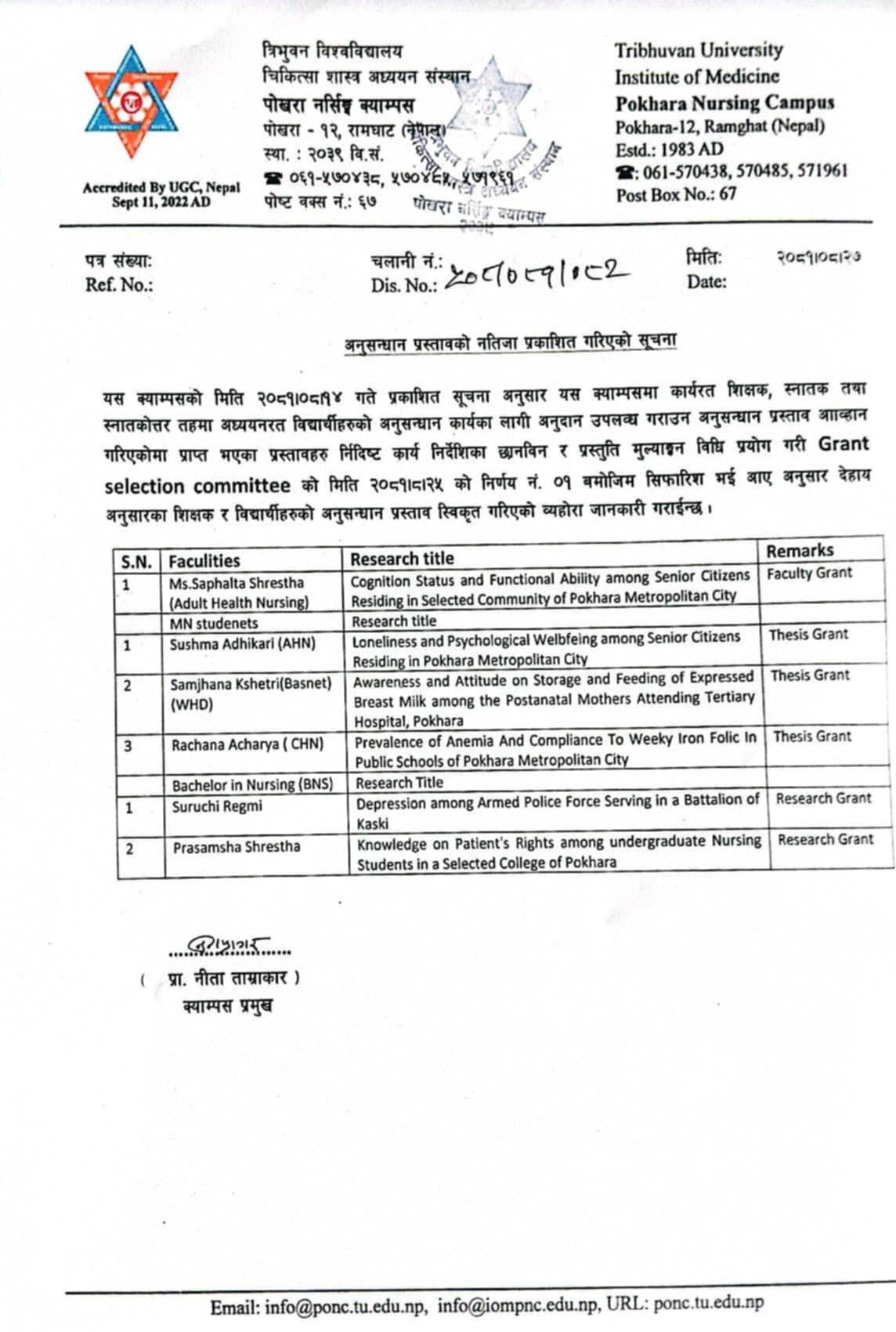 अनुसन्धान प्रस्तावको नतिजा प्रकाशित गरिएको सूचना