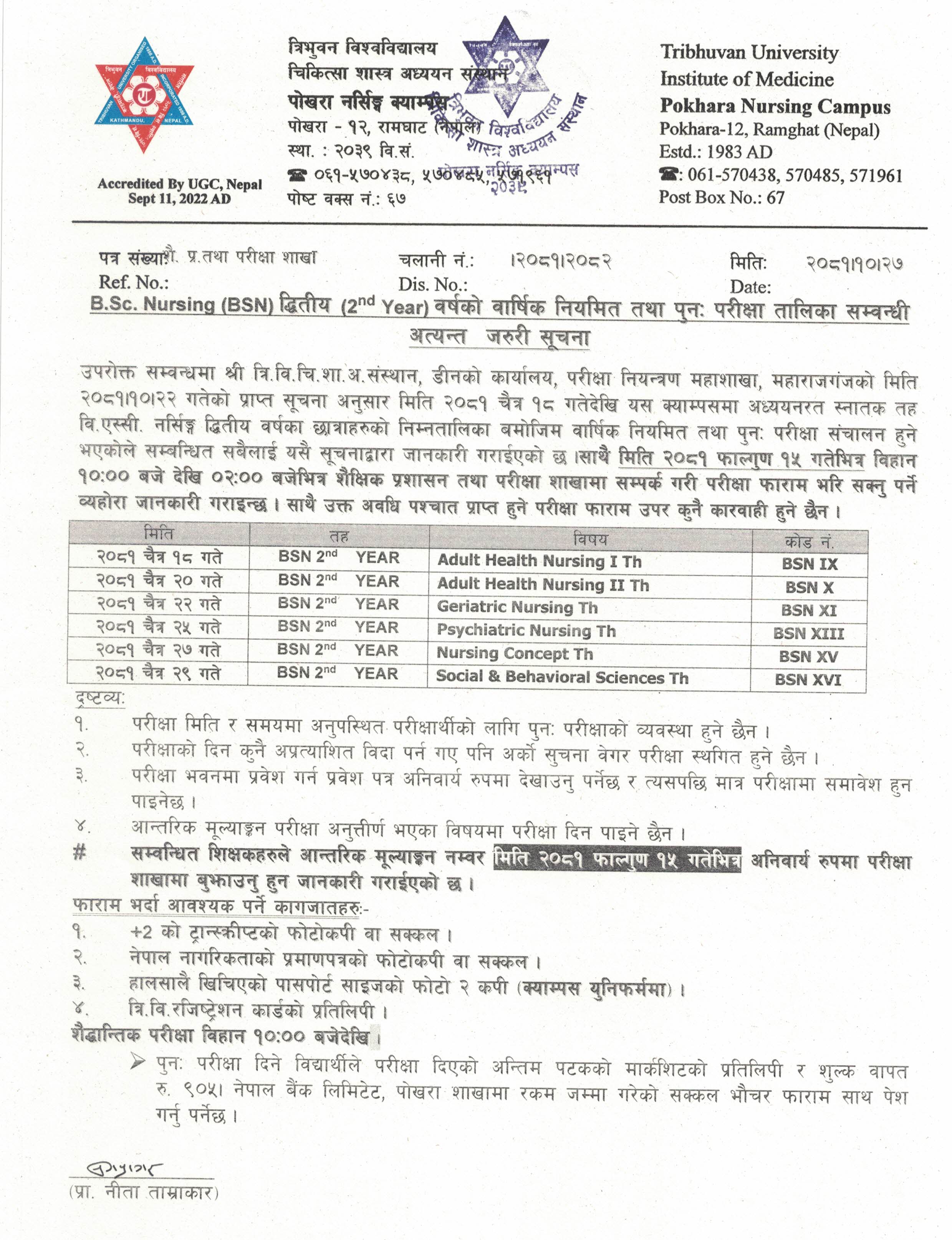Bsc Nursing 2nd Year काे वार्षिक नियमित तथा पुन परीक्षा तालिका सम्बन्धी सूचना