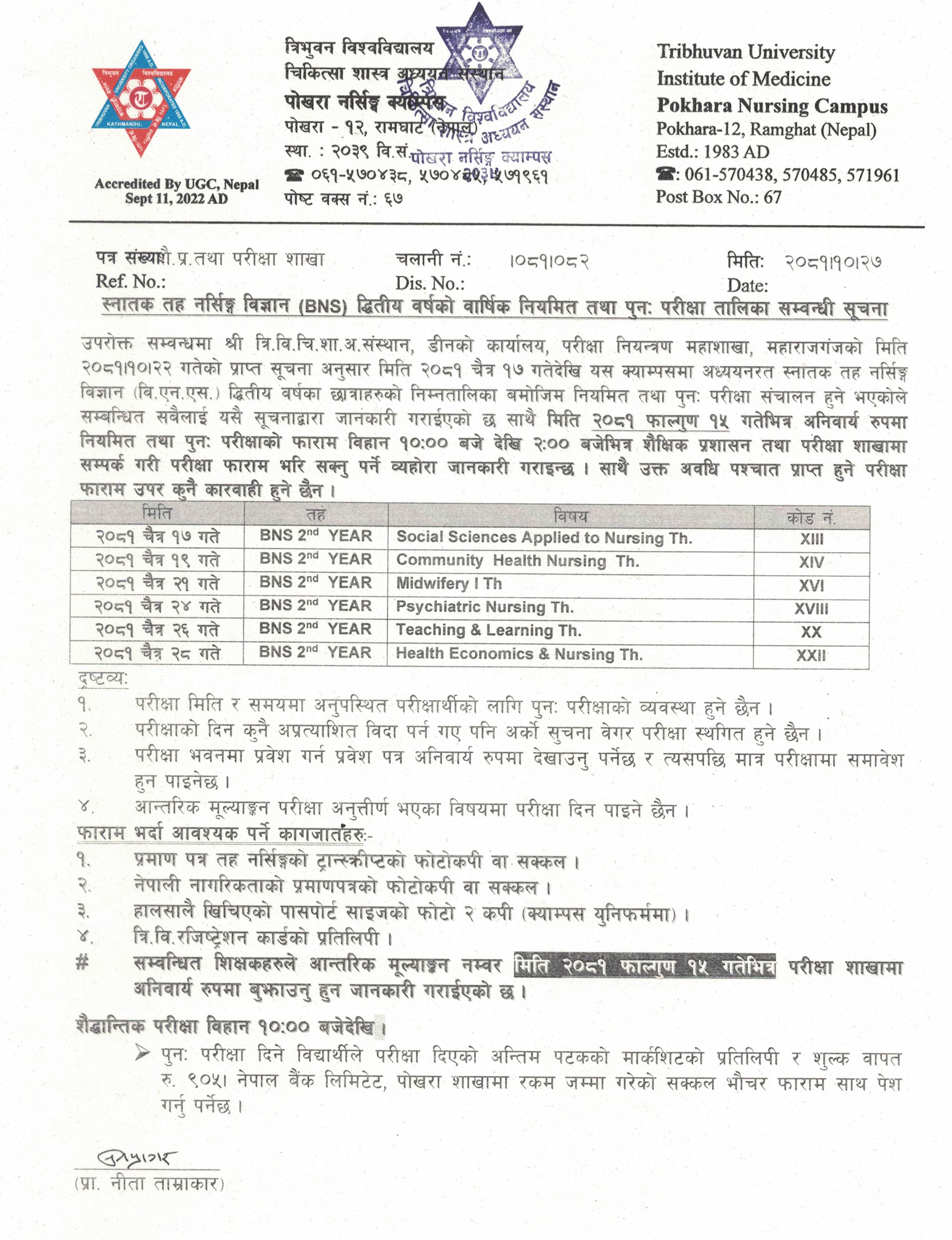BNS Nursing 2nd Year काे वार्षिक नियमित तथा पुन परीक्षा तालिका सम्बन्धी सूचना