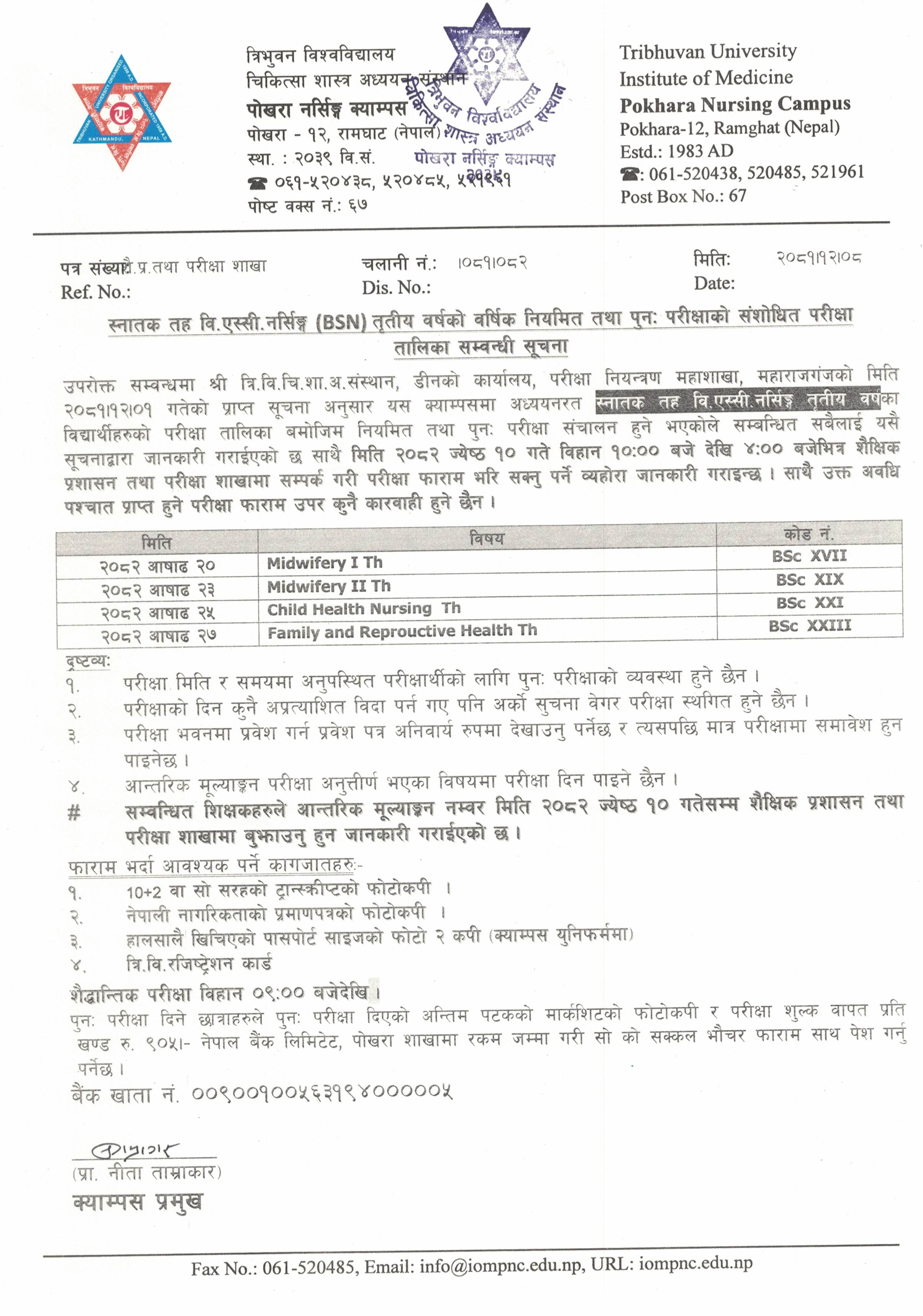 स्नातक तह वि.एस्सी. नर्सिङ्ग (BSN) तृतीय वर्षको वर्षिक नियमित तथा पुनः परीक्षाको संशोधित परीक्षा तालिका सम्बन्धी सूचना