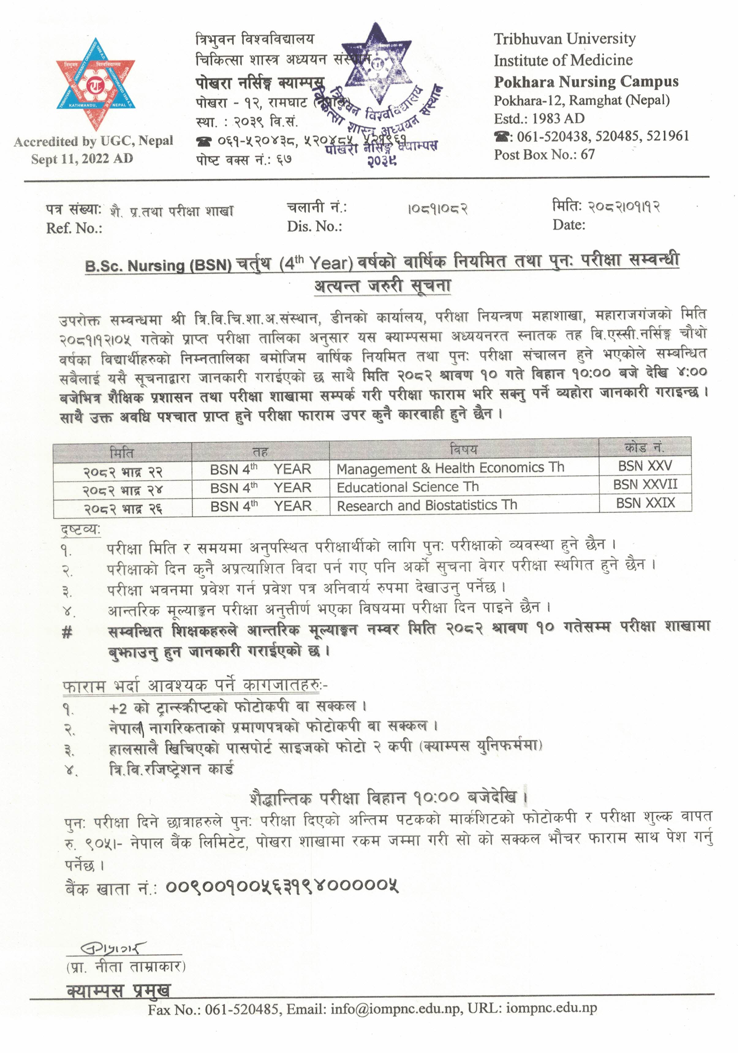 स्नातक तह वि.एस्सी. नर्सिङ्ग (BSN) तृतीय वर्षको वर्षिक नियमित तथा पुनः परीक्षाको संशोधित परीक्षा तालिका सम्बन्धी सूचना